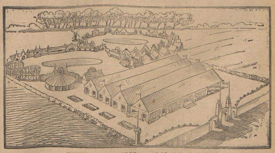 Ere-Poort komt men, na een prachtig speciaal aangelegd, plantsoen, in de 3600 vierk. M. groote tentoonstellingshallen,