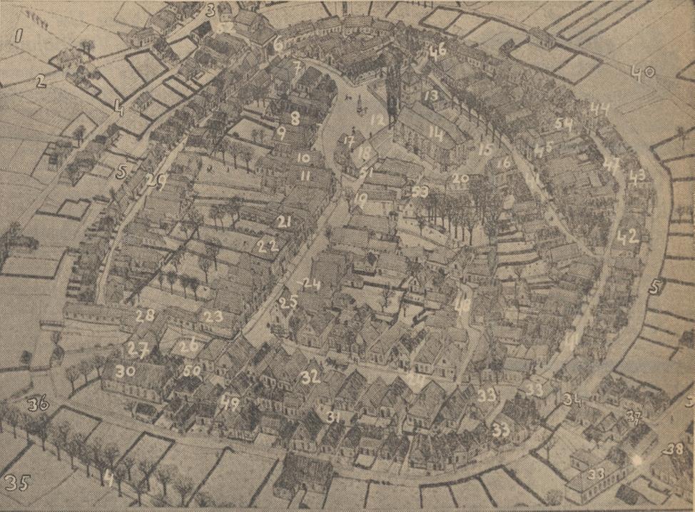 van de bebouwing. Op toelichting van de tekening zijnde straten e.d. vermeld met. de toen geldende namen: