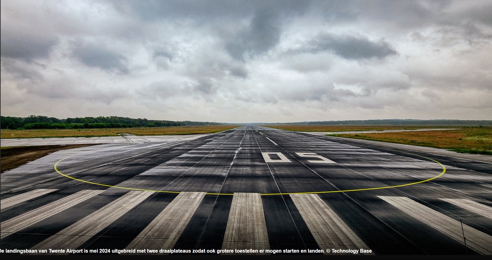 De landingsbaan van Twente Airport is mei 2024 uitgebreid met twee draaiplateaus zodat ook grotere toestellen er mogen starten en landen. © Technology Base