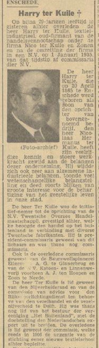 Harry ter Kuile Nicolaas H.zn was lid fa. Nico ter Kuile & zonen, textielfabr. te Enschede, bereisde Oost-Afrika voor zaken; 1890-1914-1926: fabrikant.