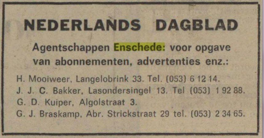 Je vindt verschrikkelijk weinig hits (33 voor abonneenummer enschede, 114 voor telefoonnummer enschede) waarvan de meesten dan ook nog voor drukkerij Joh Enschede, terwijl ze negen miljoen kranten online hebben. Waren het er meer geweest dan had ik wel een ander gekozen voor dat politiebericht :( , maar dat was de enige hit met vier cijfers in mijn zoekbegrenzing 1960-1980.