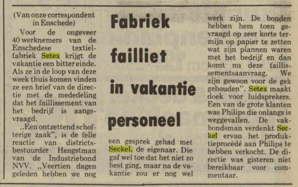 E.J. Seckel was ook eigenaar van de naastgelegen Textielfabriek Setex aan de Oldenzaalsestraat 466. Dit bedrijf is in 1978 failliet gegaan en het pand is in 1980 gesloopt.