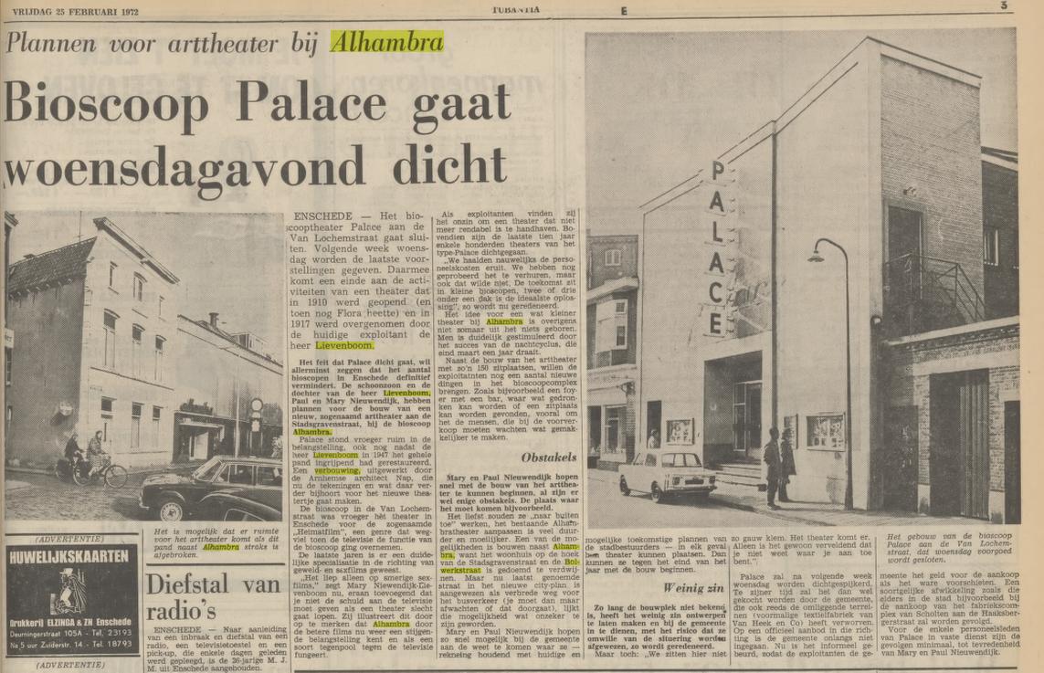 Of de oude gevel verstopt zit onder de nieuwe gevel weet ik niet. Wel is bekend dat de bioscoop Alhambra werd verbouwd wegens uitbreiding met nieuwe (theater)zalen in 1972. Zie onderstaand krantenbericht uit de Tubantia van 25-2-1972, waarin o.m. bekend werd gemaakt dat de Bolwerkstraat moet worden verbreed i.v.m. het nieuwe cityplan. Er wordt daarbij ook genoemd i.v.m. het busverkeer, maar is toch later geen busverkeer daar geweest. De bioscoop Alhambra kreeg door de verbouwing meerdere theaterzalen, waardoor de bioscoop en het vroegere theater Palace aan de Van Lochemstraat (ook eigendom van de Fam. Lievenboom) niet meer nodig was en dus werd gesloopt. In het woonhuis Stadsgravenstraat 25 hoek Bolwerkstraat woonde dus vroeger de heer Lievenboom, exploitant van de bioscopen Alhambra en Palace.MarcBrugge schreef: ↑vr feb 04, 2022 2:34 pm Ik heb hier op het forum ergens gelezen dat de oude gevel gewoon verstopt zit onder de nieuwe gevel. In hoeverre is dit waar? Wat is er trouwens gebeurd met dat gebouw links van Alhambra? Dat is nu gewoon een doorlopende straat.