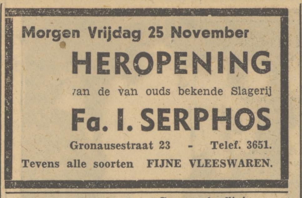 3651 Serphos, N. Slagerij, Lid Fa. I.N. Serphos, Gronausestraat 23