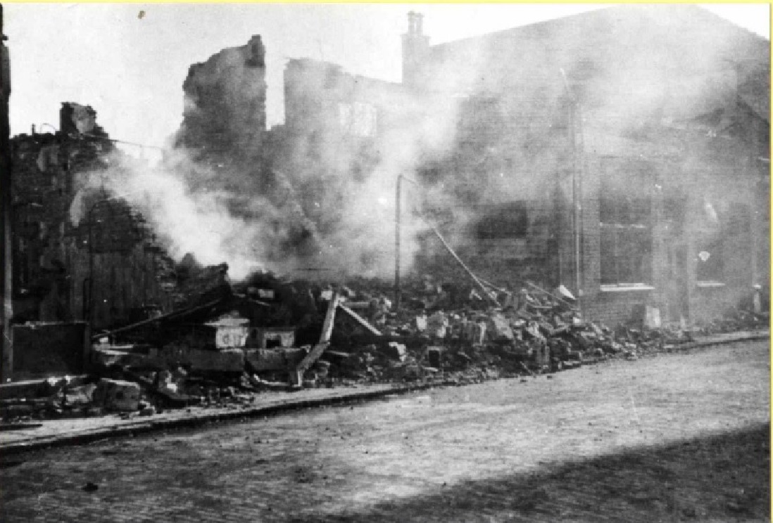 Ook van het pand Nieuwstraat 5 heb ik geen afbeelding kunnen vinden. Naast het huidige pand Nieuwstraat 3 is dat nu een open terrein. Ik denk dat het pand in de oorlog in 1944 door het bombardement is verwoest. Zie ook onderstaande foto uit het gemeentearchief.