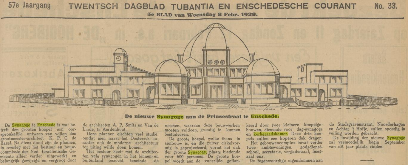 Prinsestraat 14-16 Synage met kerkeraadskamer krantenbericht Tubantia 8-2-1928.jpg