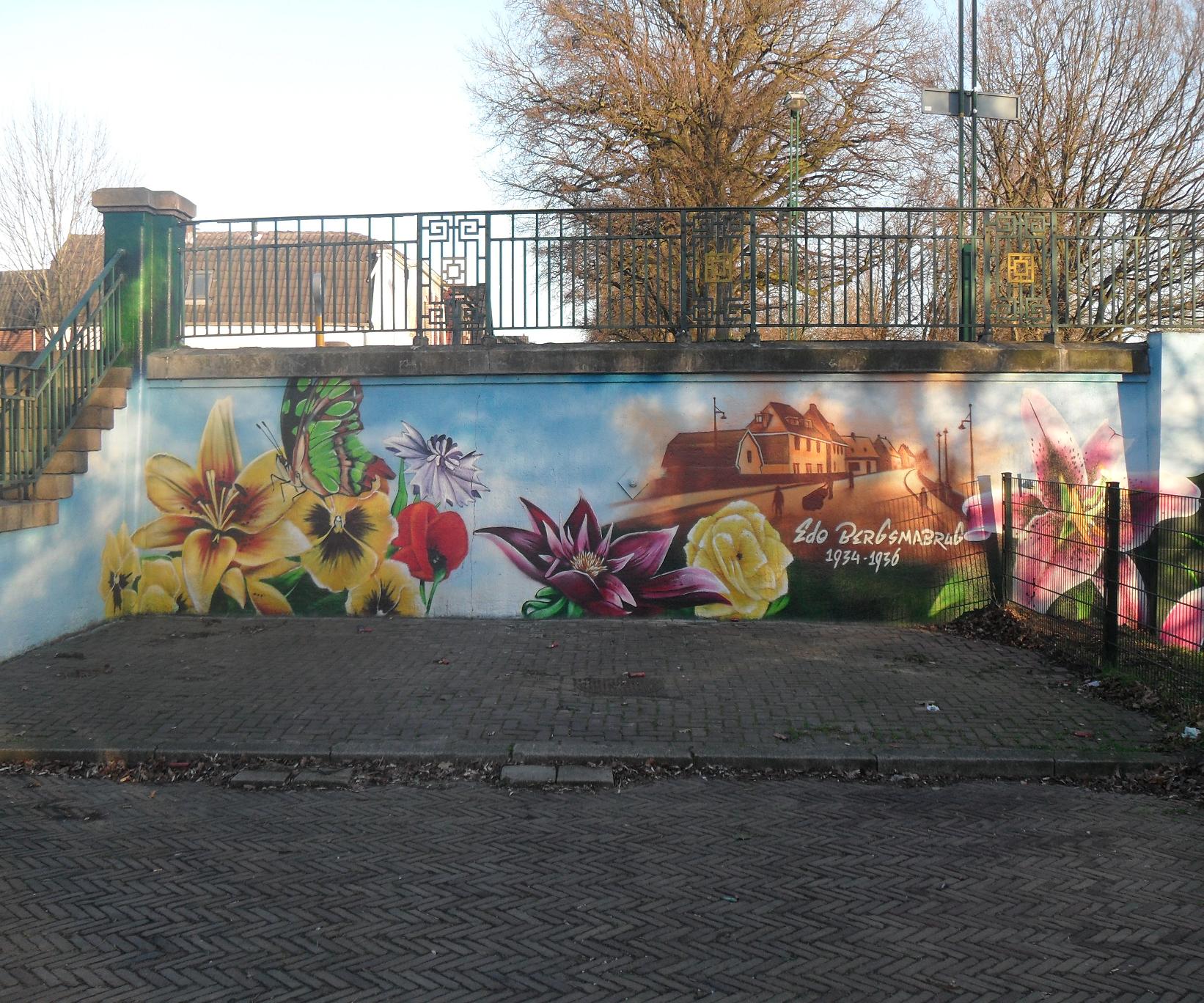 Lijkt mij ook de afbeelding van de Edo Bergsmabrug zoals op onderstaande foto is te zien. Ik weet niet of Frank bedoeld waar de wandbeschildering is gemaakt.Hendrik schreef:Ja de Edo Bergsmabrug. Maar in een ouder beeld dan ano nu. Op de hoek van de Ribbeltsweg stonden een paar afdakswoningen zo schuin als op het plaatje.