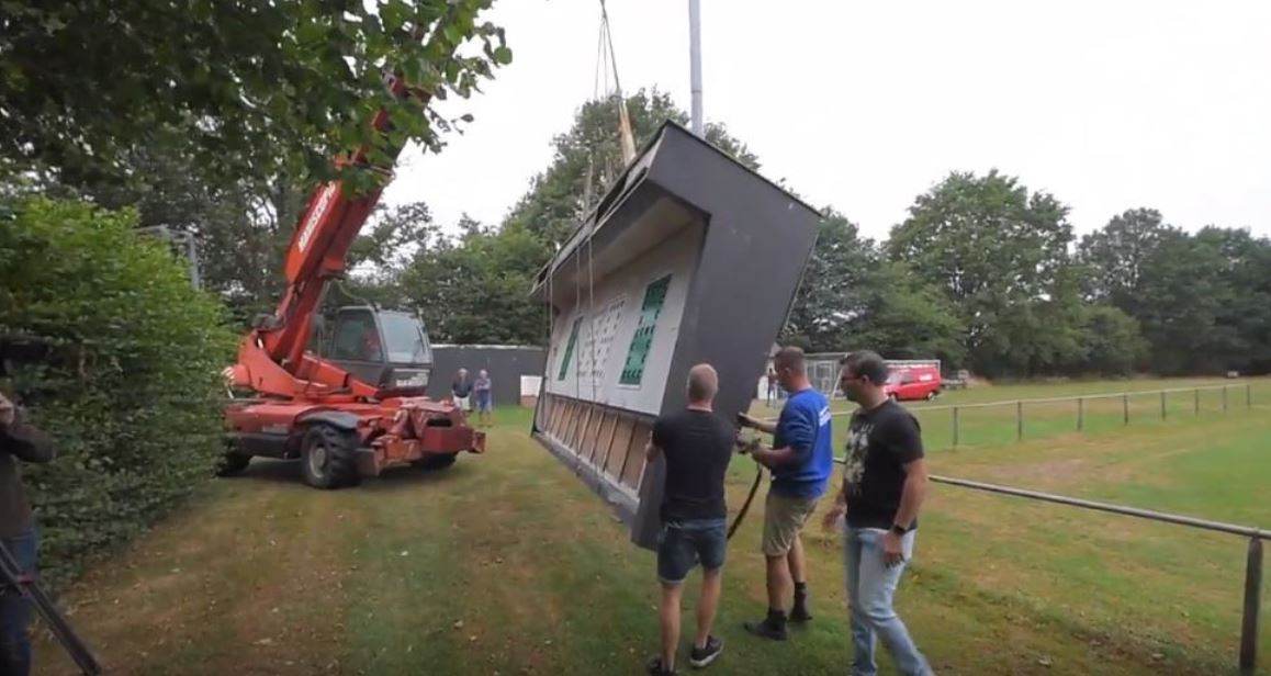 Het oude scorebord uit Stadion Diekman keert terug op oale groond. Het gevaarte, dat sinds 1998 op de velden van SC Rekken stond, is daar zaterdagochtend afgebroken en wordt na renovatie weer opgebouwd op sportpark Het Diekman. Brand dreigde even roet in het eten te gooien.