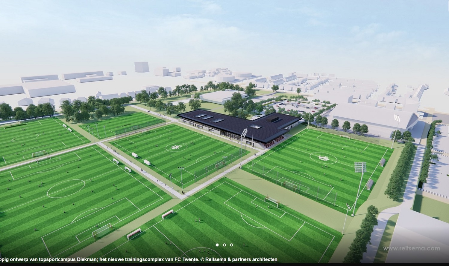 Voorlopig ontwerp van topsportcampus Diekman; het nieuwe trainingscomplex van FC Twente. © Reitsema & partners architecten