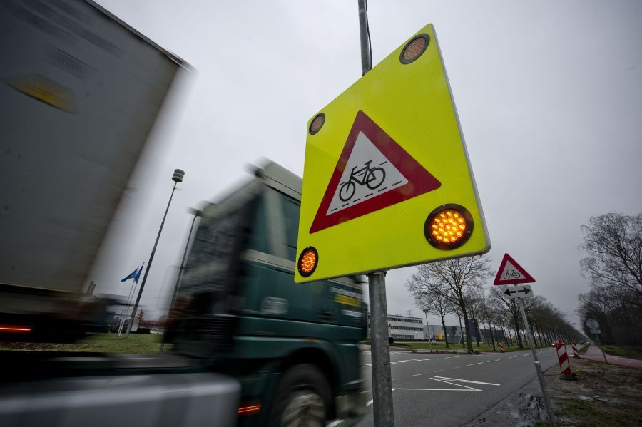 ENSCHEDE/BOEKELO - Twee grote en fel verlichte waarschuwingsborden. Die moeten voorlopig fietsers op de beruchte oversteek op de Windmolenweg beschermen.