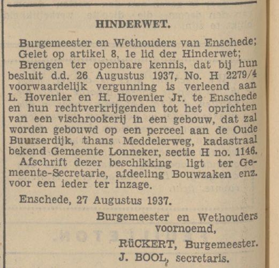 Meddelerweg Vischrookerij L. Hovenier en H. Hovenier Jr. Hinderwetvergunning krantenbericht Tubantia 26-8-1937.jpg