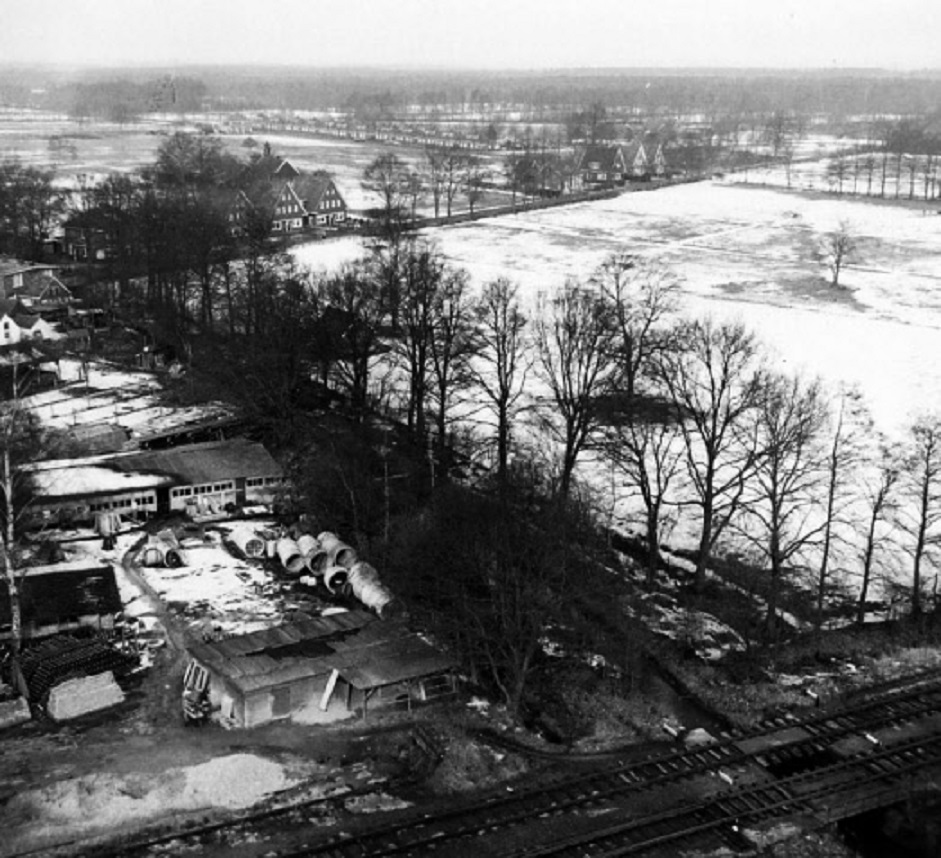 Losplaats 9 naar Windmolenweg bij spoorlijn Hengelo-Enschede en bouwmaterialenhandel Kamp 1964 gezien vanaf Boekelose Stoombkekerij.jpg