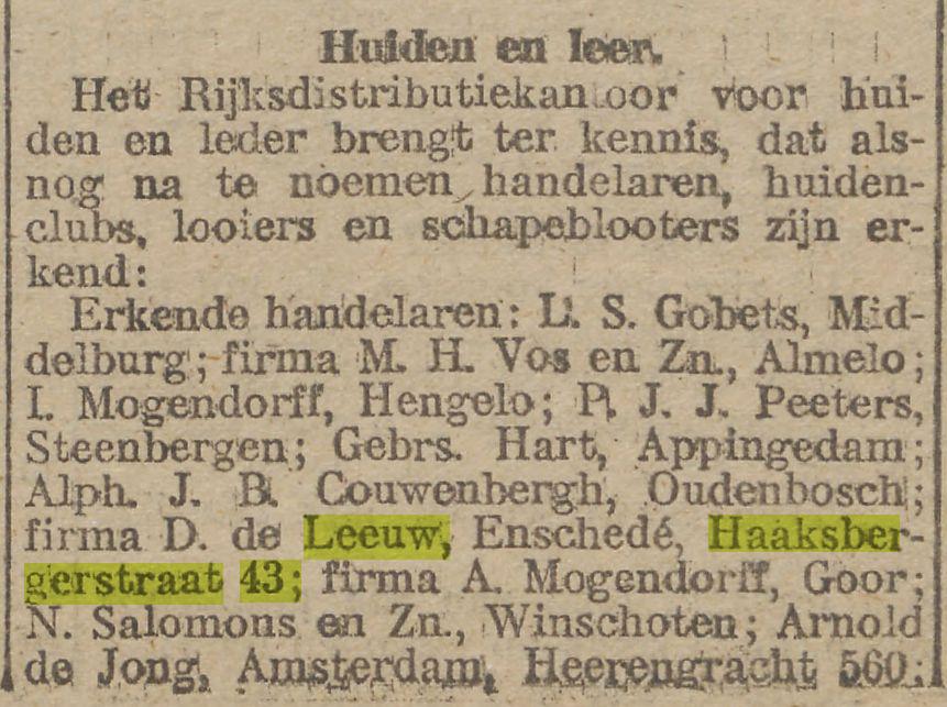 Leeuw, D. de, Vleeschhandel, Haaksbergerstraat 43.