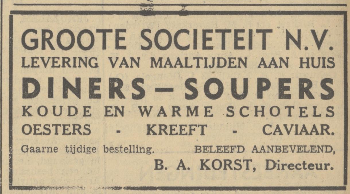 Korst B.A. gerant Groote Societeit Langestraat 45 krantenbericht 22-12-1937 advertentie 27-12-1937