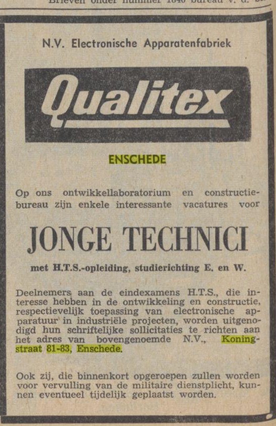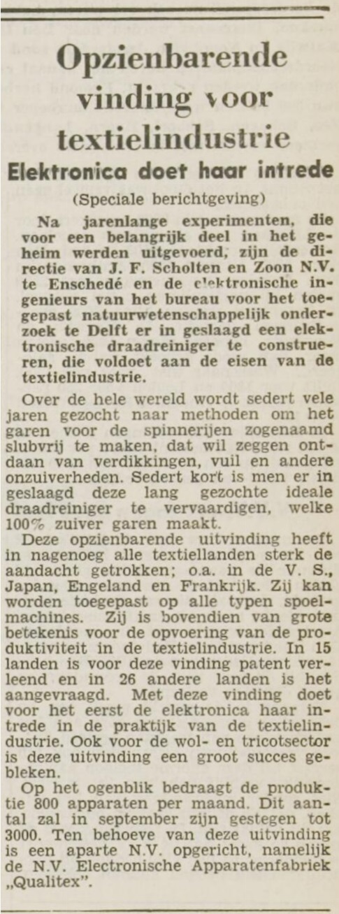 N.V. Electronische Apparatenfabriek Qualitex was dus een dochtermaatschappij van textielfabriek J.F. Scholten en Zoon N.V.. Zie ook krantenartikel in Leidsch Dagblad van 23-4-1957.