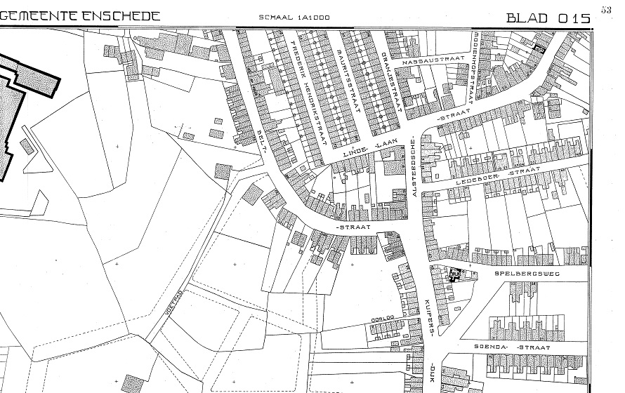 Dat lijkt mij ook nu ik het plattegrondje van Bart zie. Het pand zou dus aan de Frederiki Hendrikstraat moeten hebben gestaan, maar daaraan grenst ook nog een pand die aan de Beltstraat staat. Was dat misschien de oude brandweerkazerne?enschedeinansichten schreef:Arie, volgens mij is dat niet het Van Heeksplein maar een stukje van de gedeeltelijk afgebroken Krim. ??
