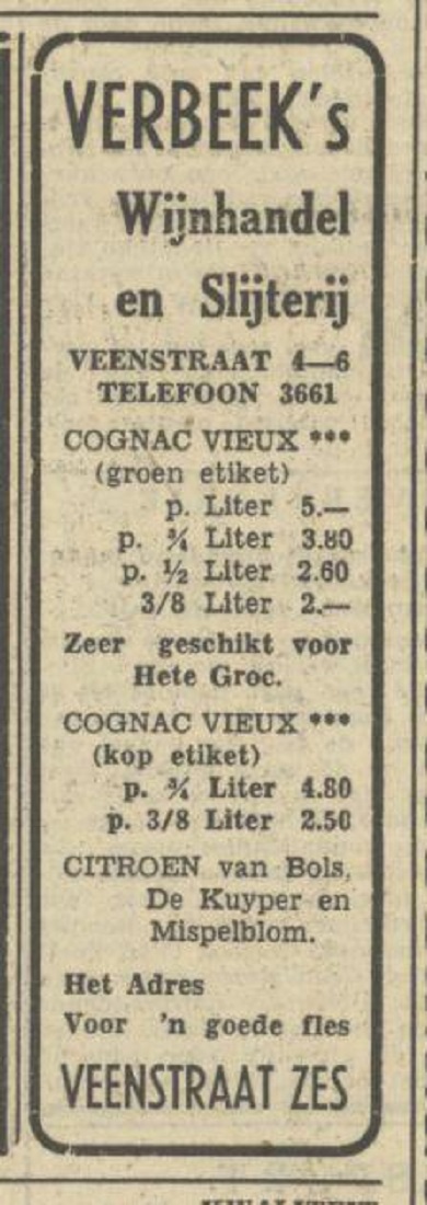 - Veenstraat 4-6 Verbeek's Wijnhandel en Slijterij advertentie Tubantia 3-6-1953.jpg (57.92 KiB) 2628 keer bekeken