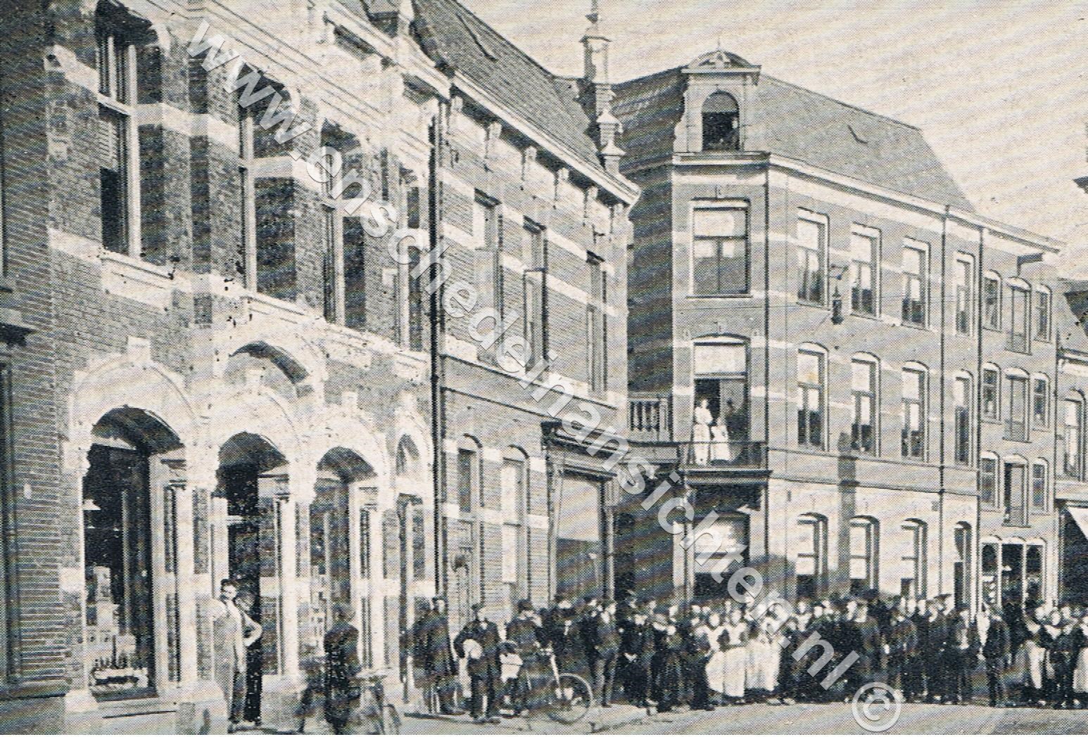 Rechts zien we de confectie waar later Piet van Dijk zijn motorzaak had. De groente winkel werd eind jaren '40 overgedaan aan Willem Dijk, nu nog bekend van de aardappelhandel. Van de huizen die we zien staan er alleen nog de uiterst rechtse op de voorgrond. Links achter op de hoek (niet zichtbaar) van de Balistraat was de kapperszaak van Schwirtz gevestigd.