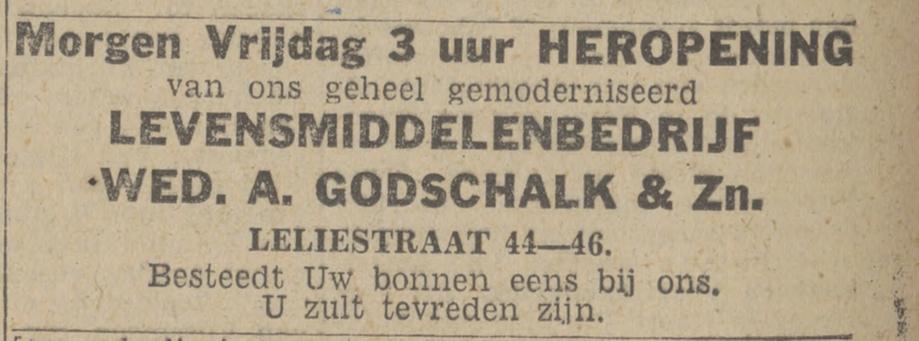 Godschalk-Nijland Wed. J. kruidenierswinkel Leliestraat 44 advertentie 10-6-1943 en 2-3-1949