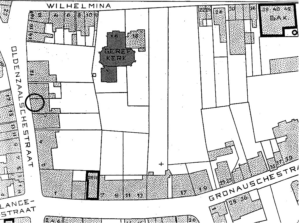 Het perceel van de Gereformeerde Oosterkerk aan de Wilhlminastraat grenst inderdaad aan het pand aan de Oldenzaalsestraat 8 en 10. (nu De Heurne)