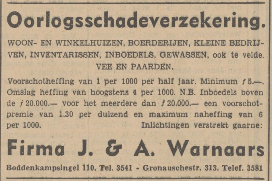 Warnaars Joh.P. katoenagent, assuradeur Boddenkampsingel 110 advertentie 21-2-1942