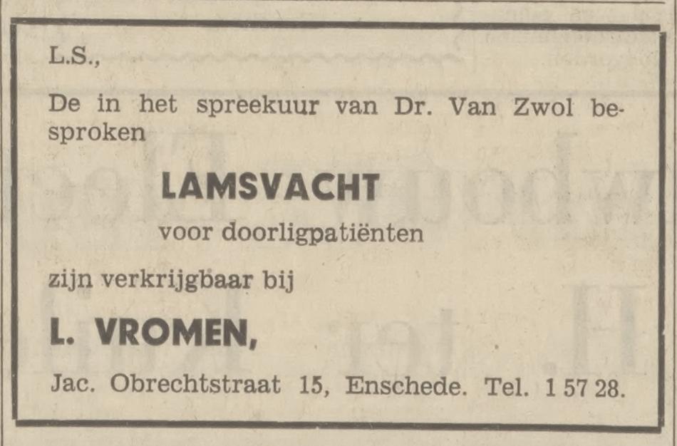 5728 Vromen, L. Vert. Fa. M. Vorst, Huidenh., Jac. Obrechtstraat 15