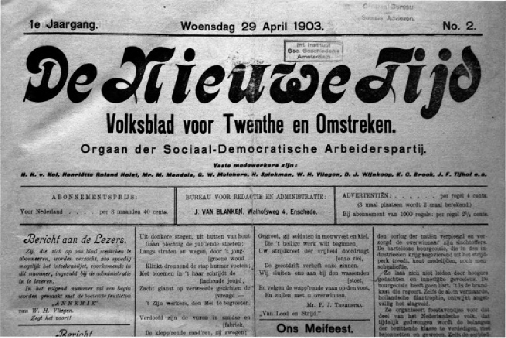 De Nieuwe Tijd was een Volksblad voor Twente en Omstreken een orgaan van de Sociaal Democratische Arbeiderspartij (SDAP). Zie ook: https://www.marxists.org/nederlands/wevers/2006/07.pdf