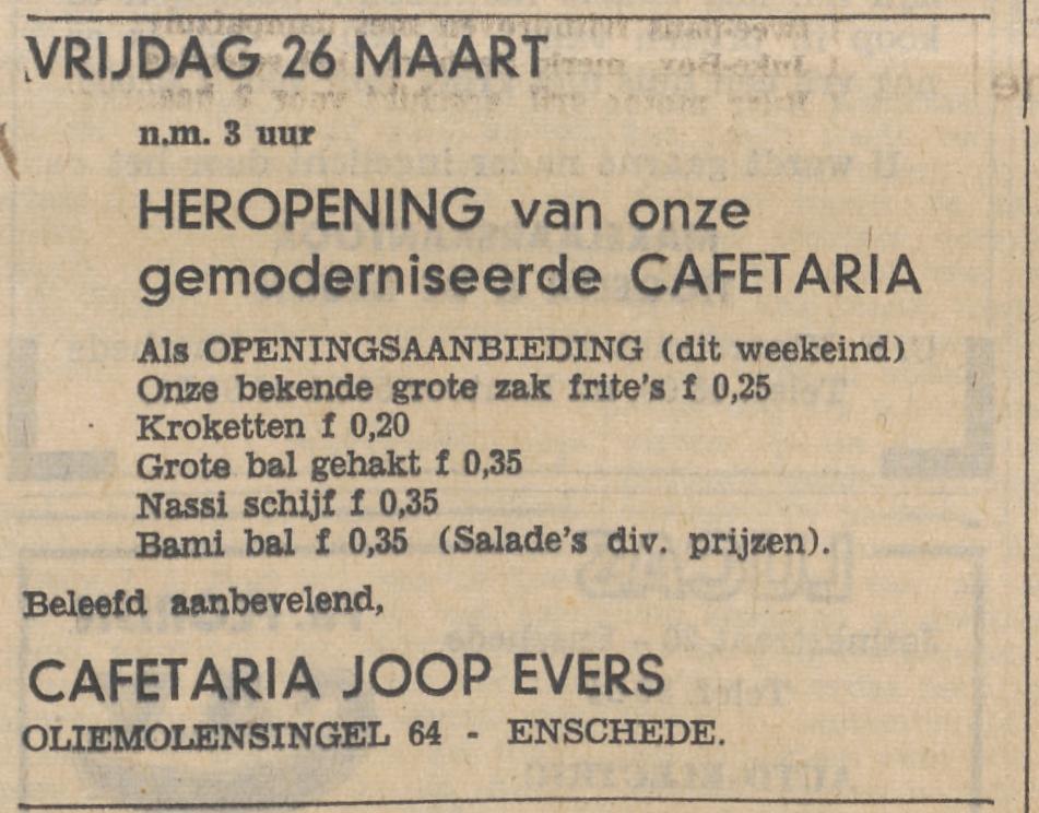 Oliemolensingel 64 cafetaria Joop Evers advertentie Tubantia 25-3-1965,