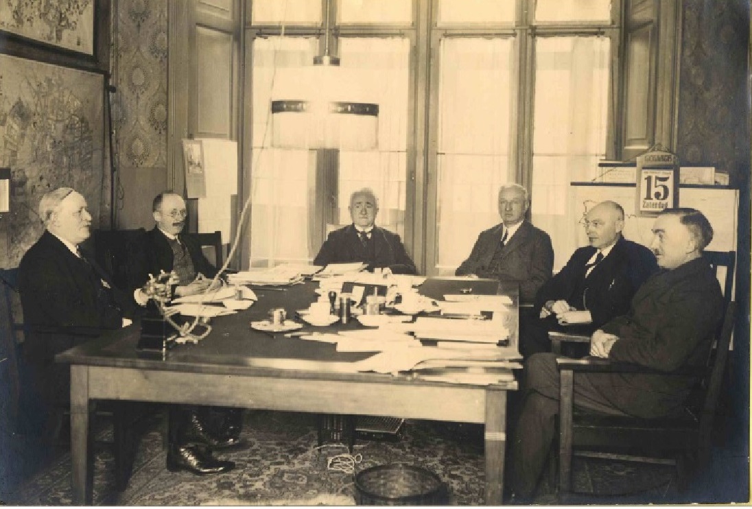 Langestraat Laatste vergadering van college van B&W in het oude stadhuis onder leiding van Burgemeester Edo Bergsma. 15-2-1930.jpg