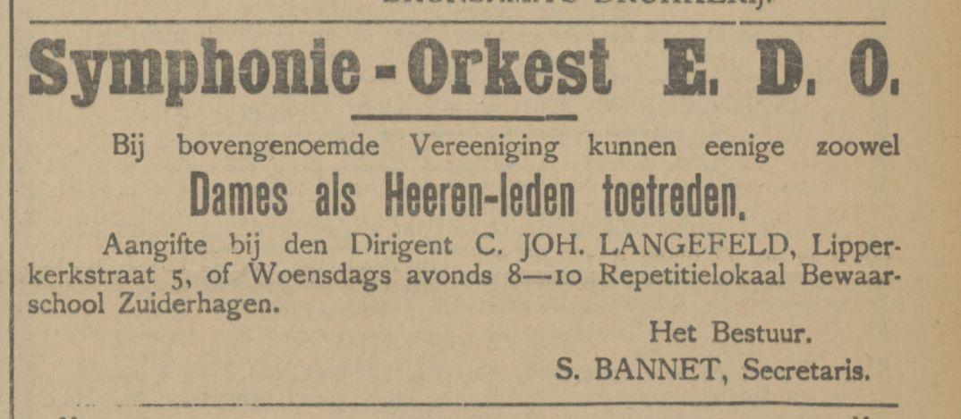 Lipperkerkstraat 5 Dirigent C. Joh. Langefeld advertentie Tubantia 6-2-1914.jpg