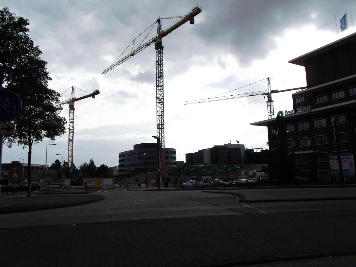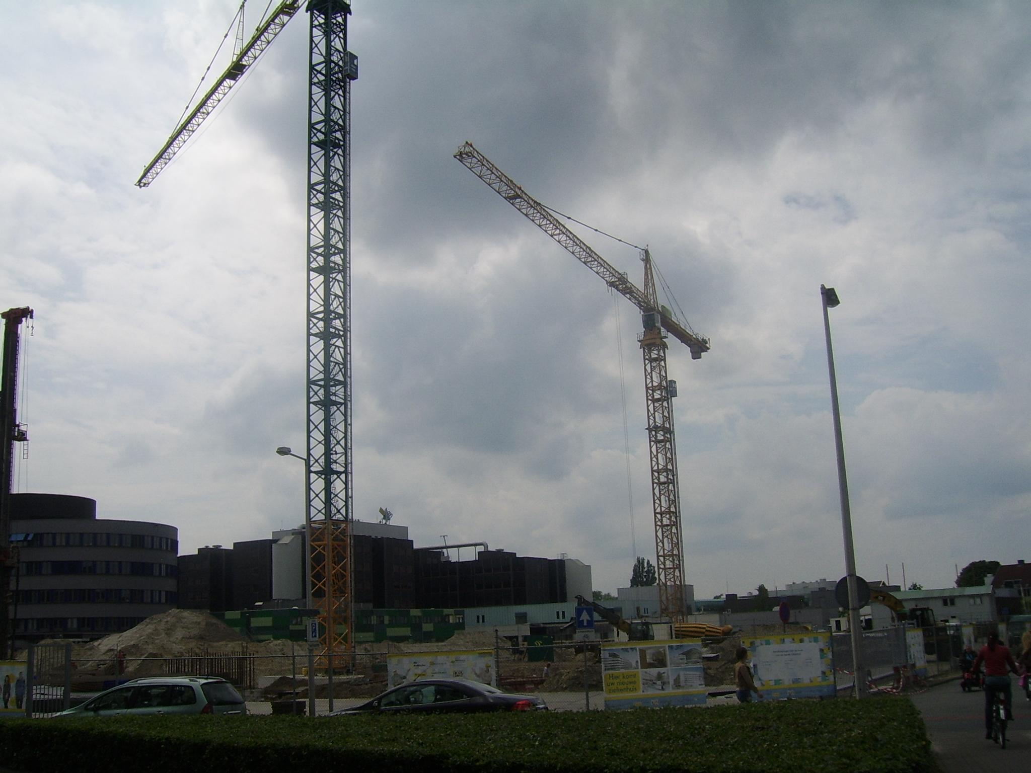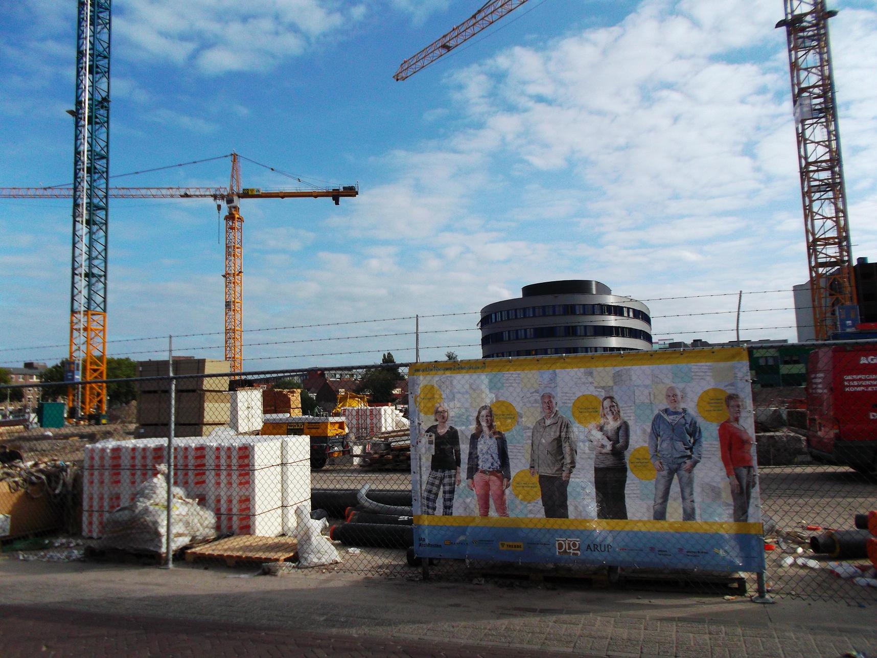 Nogmaals de 3 kranen met op de voorgrond het bouwdoek met de afbeelding van uw verslaggever