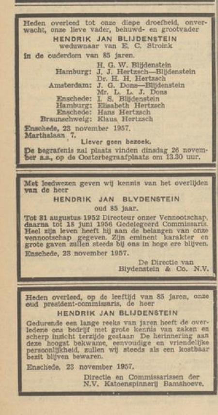Hendrik Jan Blijdenstein (overleden 25-11-1957) was gehuwd met Elisabeth Catharina Stroink (overleden 5-12-1949). zie: https://www.genealogieonline.nl/genealo ... k/I974.php