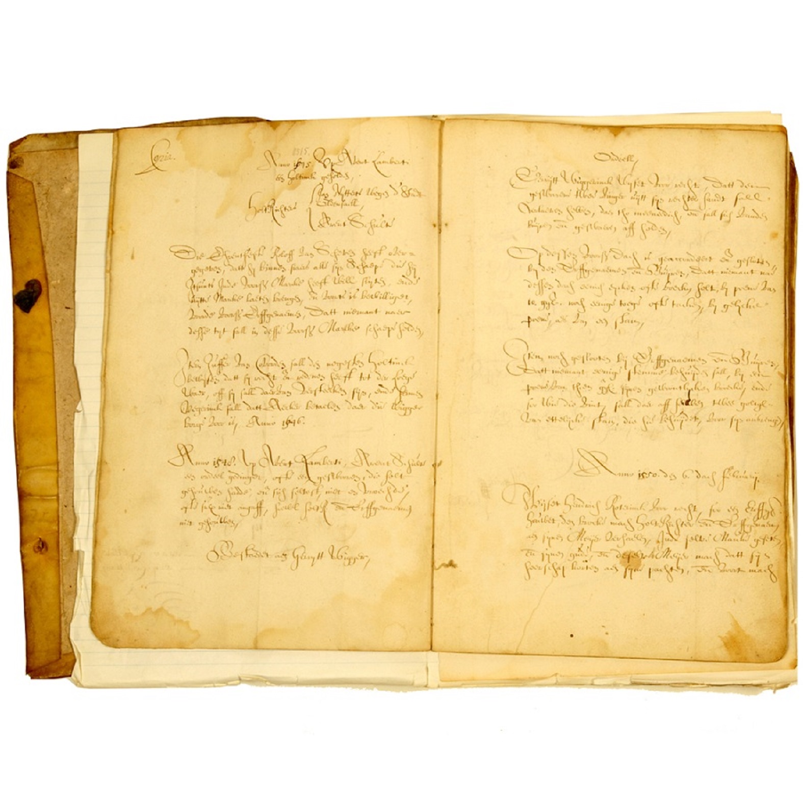Markeboek, papier in perkament, van de Marke Lonneker waarin de notulen van de Marke vergaderingen (holtings) werden opgeschreven. In dit boek staan de verslagen van 1606 tot 1716. Collectie: Twentse Welle.