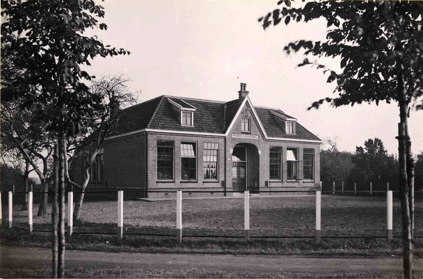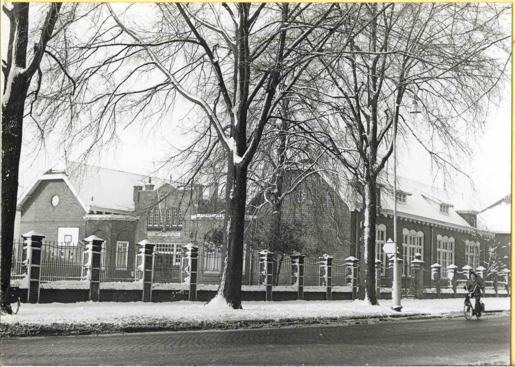 De bij de school horende kleuterschool zat eerst op zolder en later in een houten noodgebouw langs de Oostburgweg.