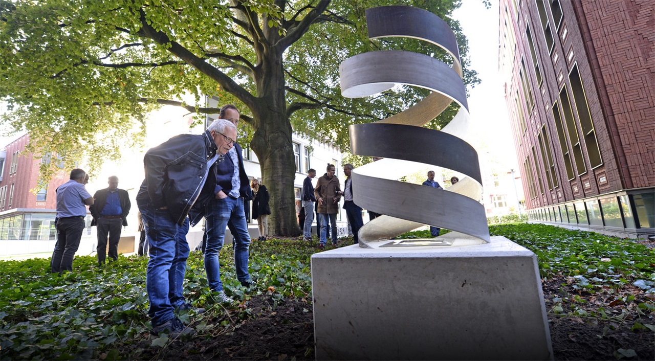Twee stalen spiralen die samen een kolom naar de hemel vormen, badend in het licht. Saxion Hogescholen heeft deze week met twee exemplaren van hetzelfde kunstwerk in Enschede en Deventer een plek om overleden studenten en medewerkers te gedenken.