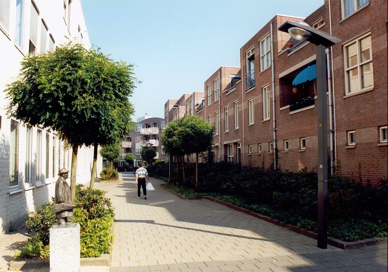 Van Essengaarde hoek Noorderhagen Beeld van man met vioolkoffer.