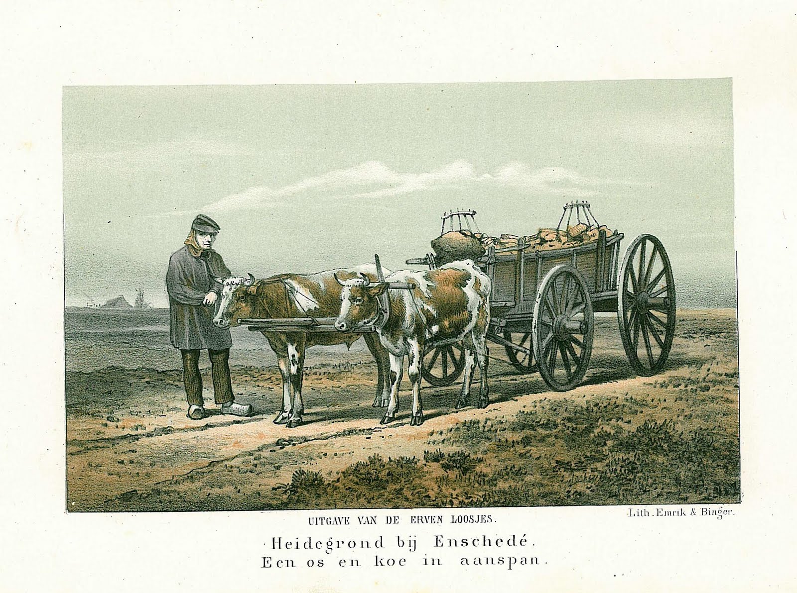 Op facebook zag ik vandaag dit plaatje van Heidegrond bij Enschede Een os en koe in aanspan prent Emrik & Binger uitgave Erven Loosjes. Ik vraag mij af of dit wel bij Enschede is gemaakt. Maar wel een mooi plaatje.