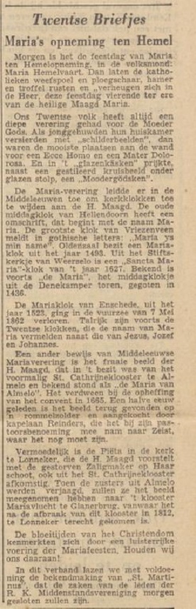 In die Twentsche Courant van 14-8-1950 ook nog dit bericht over de viering Maria ten Hemelopening