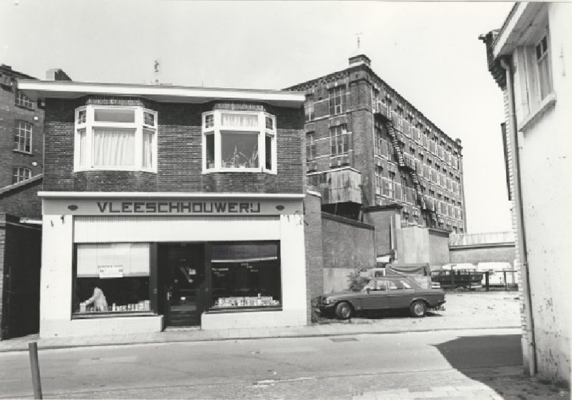 van Lochemstraat 12 De Vleeschhouwerij met daarachter eed deel van de fabriek van Van Heek & Co aan de Parallelweg 22-3-1980..jpg