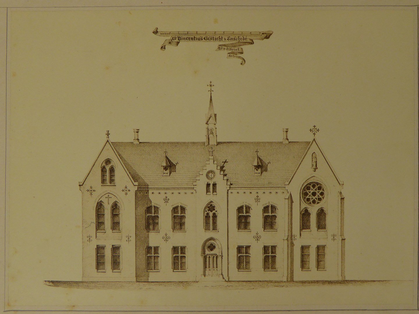 Deze foto van een tekening komt van de site van het Museum Catharijne Convent in Utrecht. Het betreft een tekening van de St. Vincentius Gesticht Enschede, architect H.J. van den Brink. Ik vraag mij af waar dit gebouw in Enschede heeft gestaan of dat het ooit wel is gebouwd. zie: https://www.catharijneconvent.nl/adlib/ ... bject_name