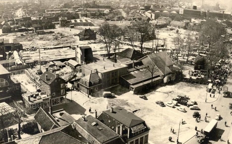Vanaf het stadhuis genomen, links zie je de achterzijde van het badhuis. Verder zie je de markt, heel veel kraampjes.