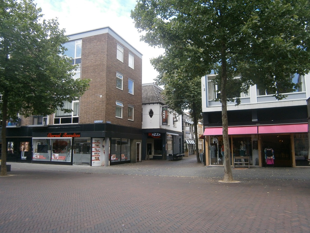 Je kijkt hier tegen de Walsstraat aan. In het winkelpand zat lang een naaimachine handel. Ik denk vanaf de sloop van achter het hofje , De fabriekspijp van de weverij die stond op de lek waar nu de Zuidmolen staat is ook nog zichtbaar.