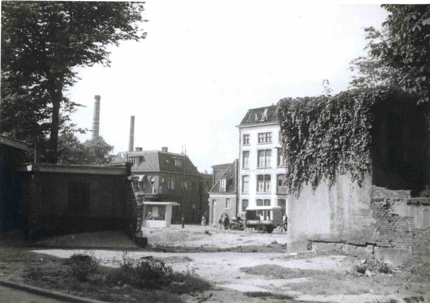 Het is het Windbrugplein gezien vanaf Achter 't Hofje. Het witte gebouw is het pakhuis van Gerhard Jannink & Zonen aan het Van Loenshof. In het linkerpand op de hoek van de Walstraat zat vroeger naaimachinehuis Pfaff. Later o.m. seksshop Huis met de Zwarte Ogen. Foto van sept. 1963.