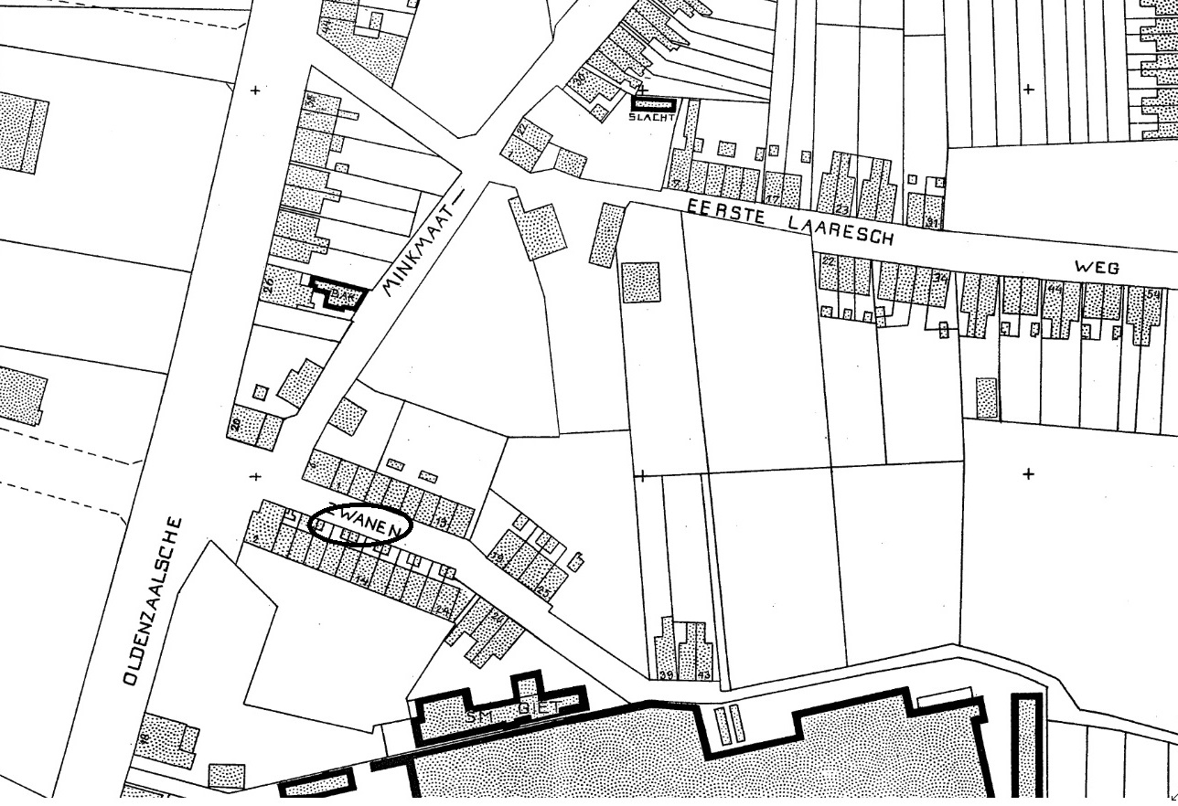 De Zwanensteeg op een kadastrale kaart van 1913. Dus een zijstraat van de Minkmaatstraat bij de hoek Oldenzaalsestraat.