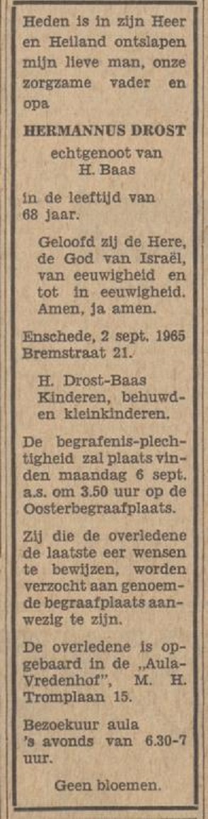 Bremstraat 23 Hermannus Drost overlijdensadvertentie Tubantia 3-9-1965.jpg