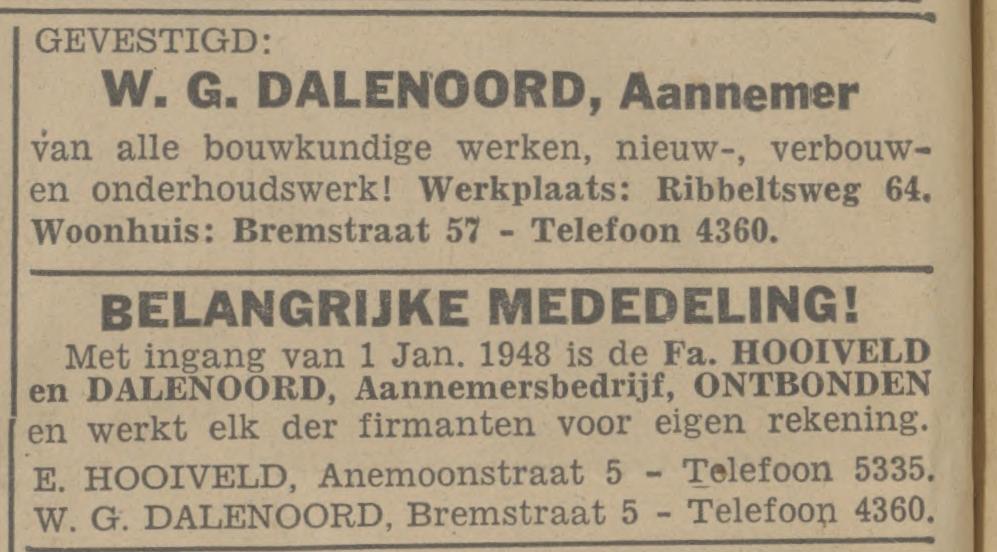 Dalenoord W.G. aannemer Bremstraat 57 advertentie31-12-1947