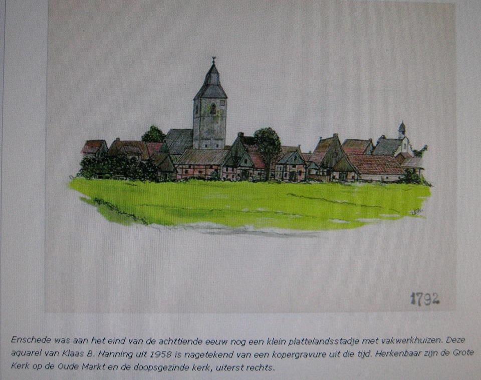 Volgens onderstaande auquarel van Klaas B. Nanning was Enschede aan het einde van de 18e eeuw nog een klein plattelandsstadje met vakwerkhuizen. Hiervan zijn nog vele in Duitse stadjes terug te vinden.
