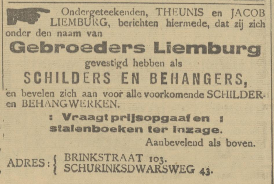 Liemburg J. huisschilder Brinkstraat 103 advertentie 26-3-1921