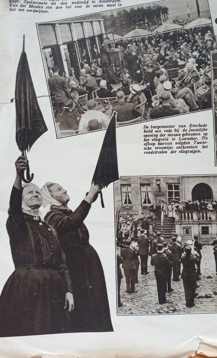 De burgemeester van Enschede hield een rede bij de feestelijke opening der nieuwe gebouwen op het vliegveld te Lonneker. Na afloop hiervan volgden Twentsche vrouwtjes enthousiast het rondcircelen der vliegtuigen.