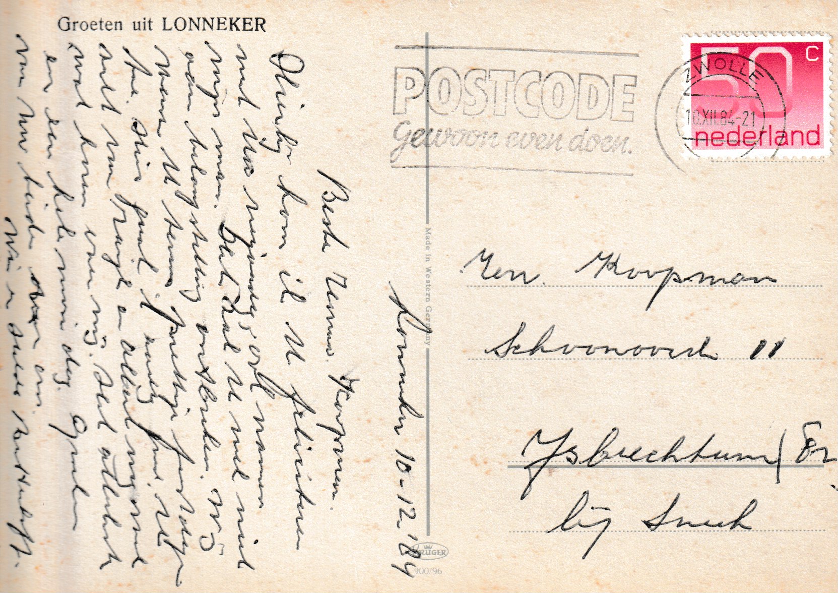 De kaart is verstuurd in 1984, geen ingekleurde kaart van 1924. Dat doen de korenschoven wel vermoeden.